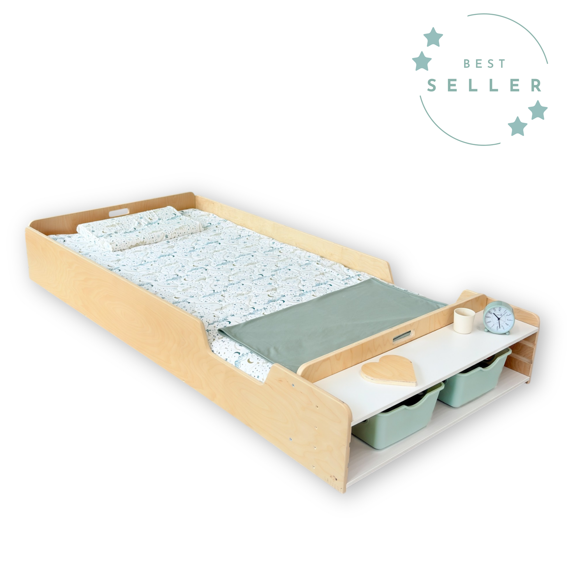 APPLE - Montessori Floor Bed with Rails & Shelves