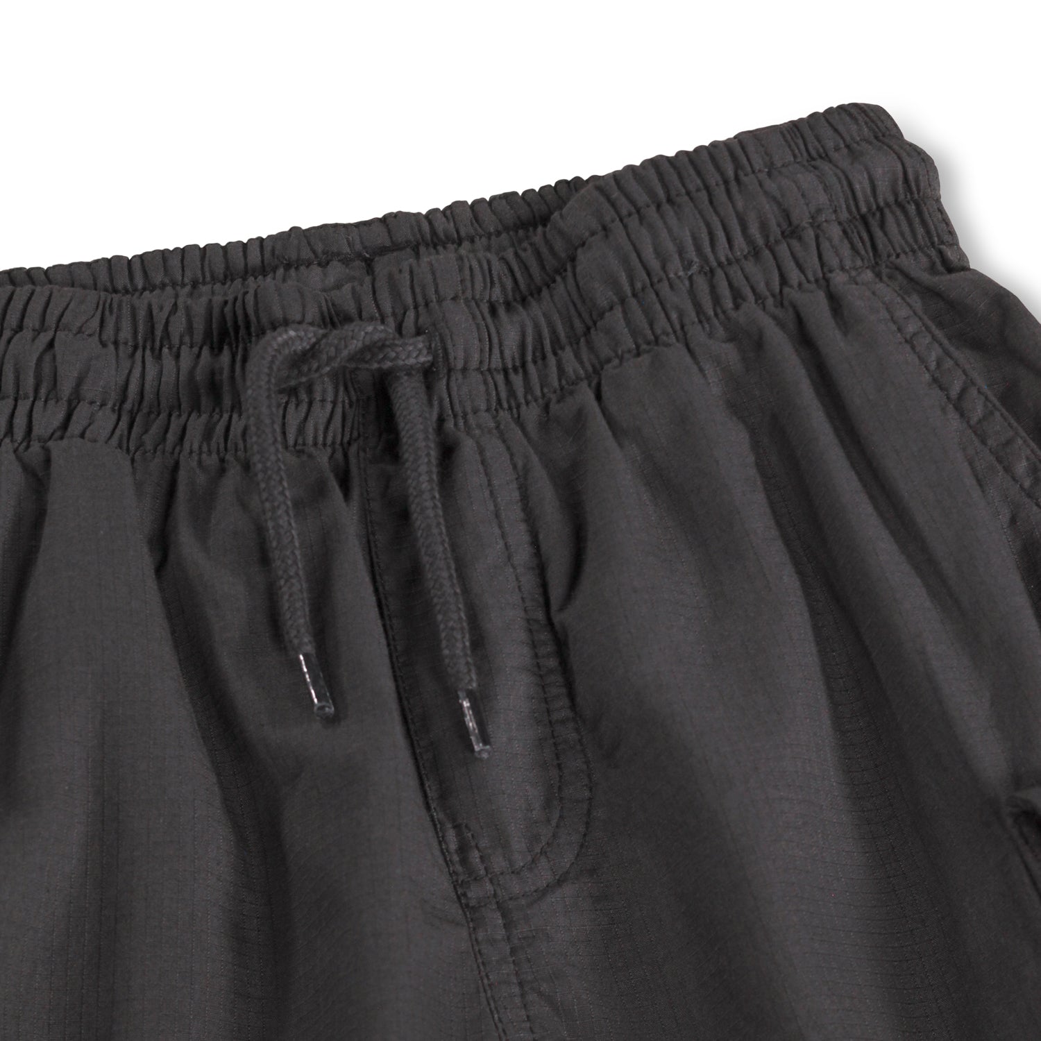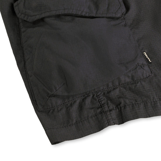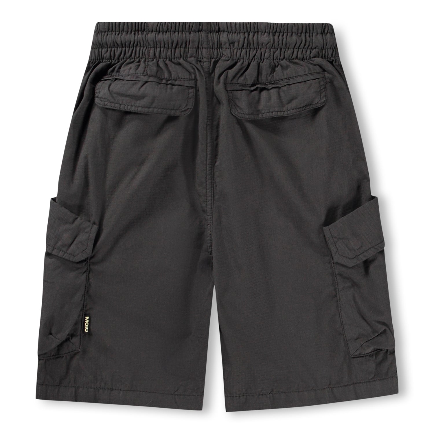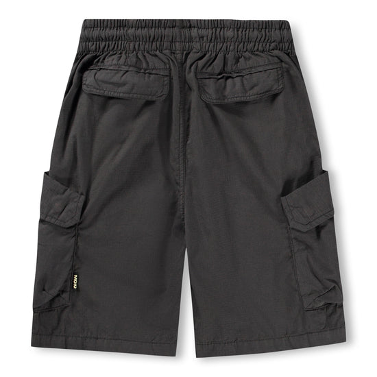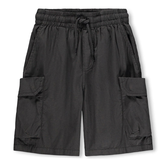 Black cargo shorts in organic cotton. These shorts have an elastic waist, internal drawstring, and regular fit. They also feature back pockets, side pockets, and a pocket on each thigh.