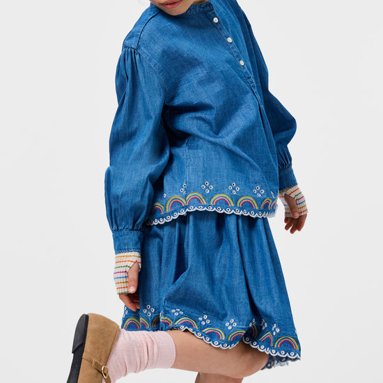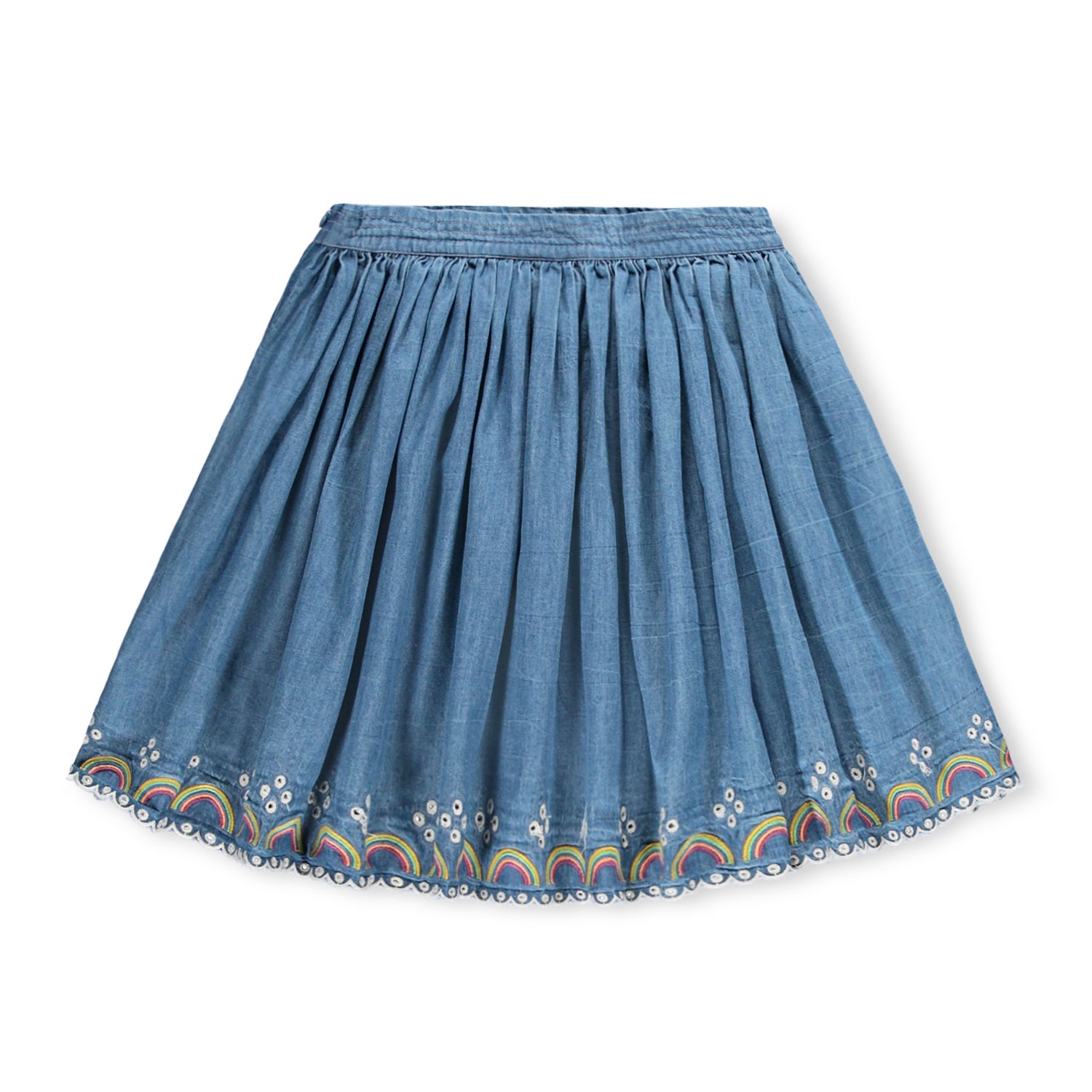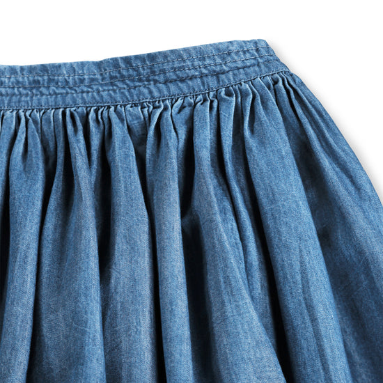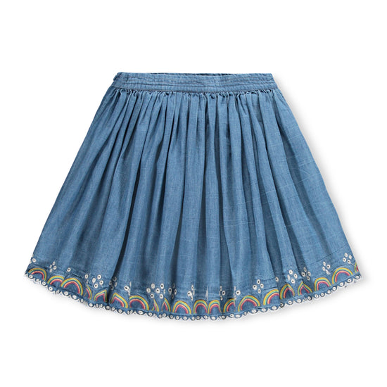 Blue denim skirt made of soft, organic cotton chambray with a beautiful broderie anglaise details along the edge. The skirt is knee-length and has a fixed waistband and an invisible side zip, making it easy to put on.