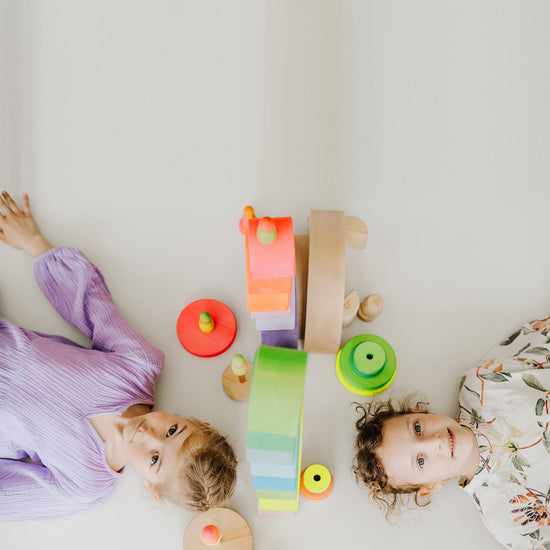 This classic toy is a must have for any baby room, and is now available in a brilliant modern neon colour way. Bring some colour and harmony to everyday with this vibrant stacking cone! The tower invites sorting by colours and sizes, stacking and creative building, especially when paired with blocks, rainbows and other toys. Or simply stack them neatly to make the tower puzzle.