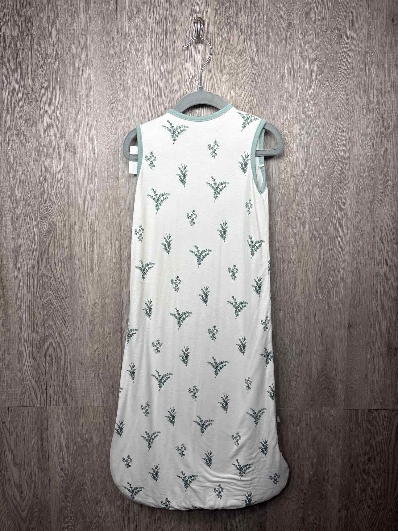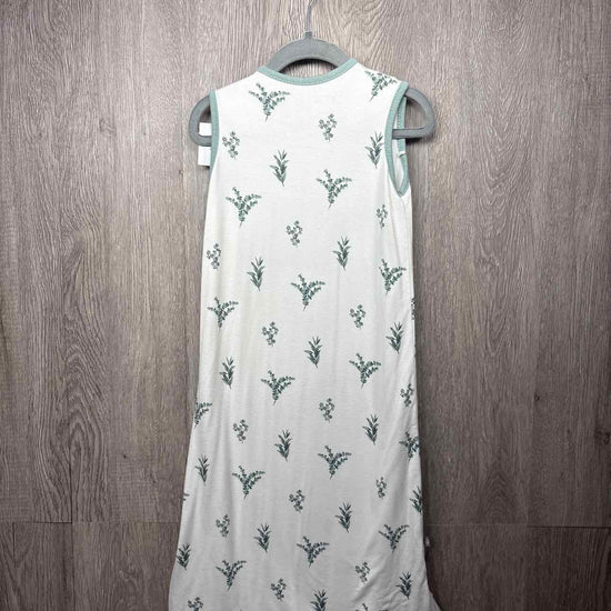 white sleeveless sleeping bag with sage green leaves print and trim, white inner lining, zipper for closure, 0.5 tog, rayon/spandex blend, filling polyester, size s #prelovedfebruary2026