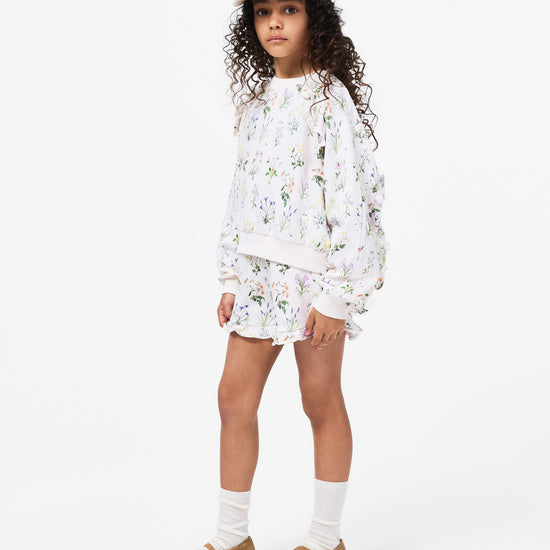 White with floral print sweatshirt, made of soft organic cotton with a round neck and ribbed edges at the neck, sleeves, and bottom. The sweatshirt has a regular fit, hip-length, and ruffles on the shoulders and back.