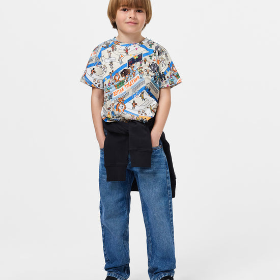 Slim fit T-shirt made of soft organic cotton with a ribbed neckline. The T-shirt has an all over print of basketball games.