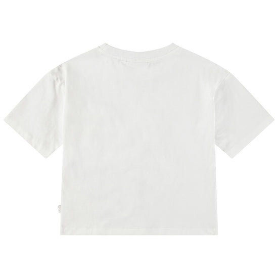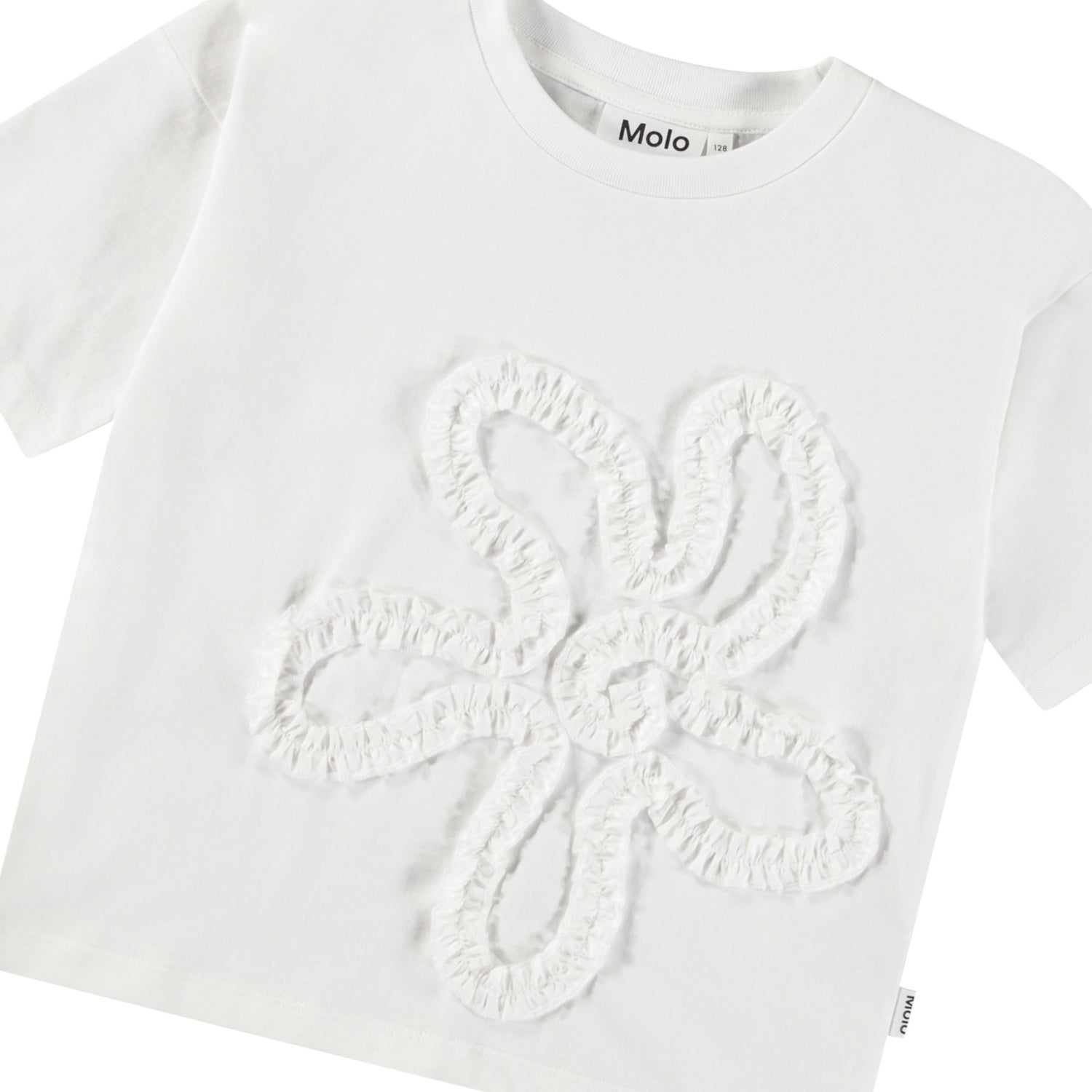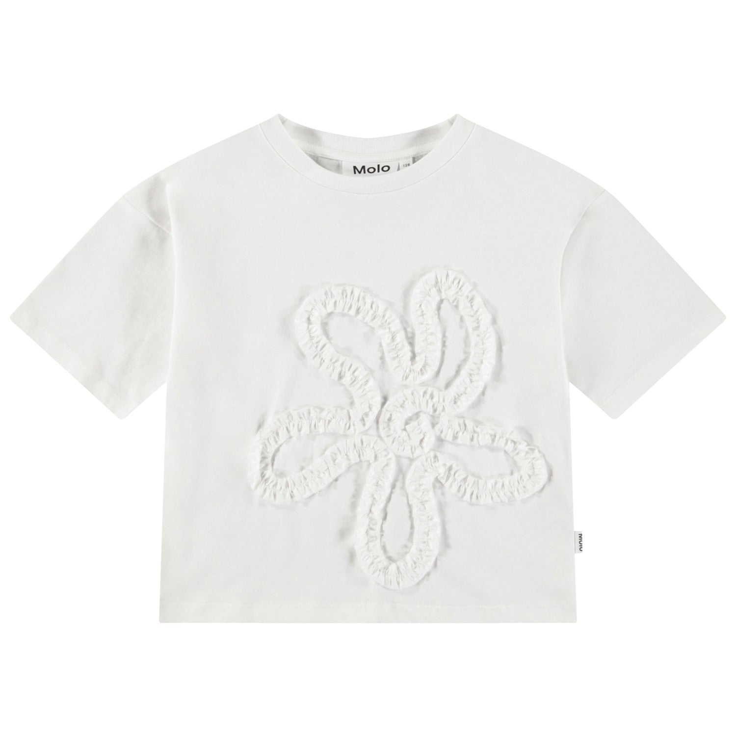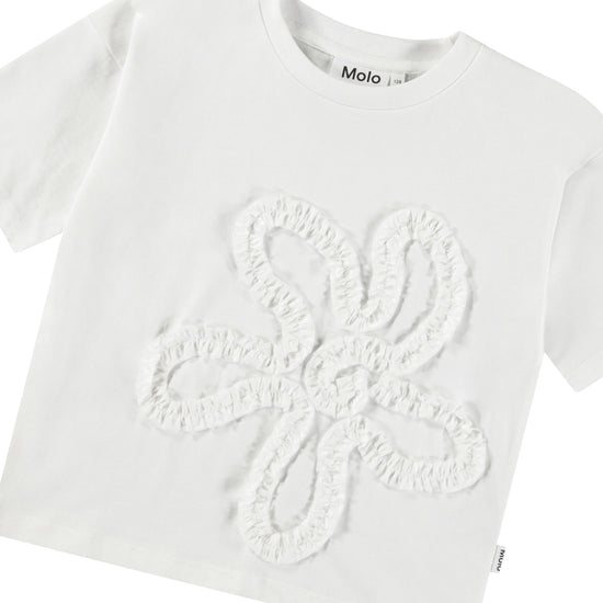 White t-shirt in soft organic cotton with ribbed neckline. The t-shirt has a loose fit with a fabric embroidery shaped like a flower on the front.