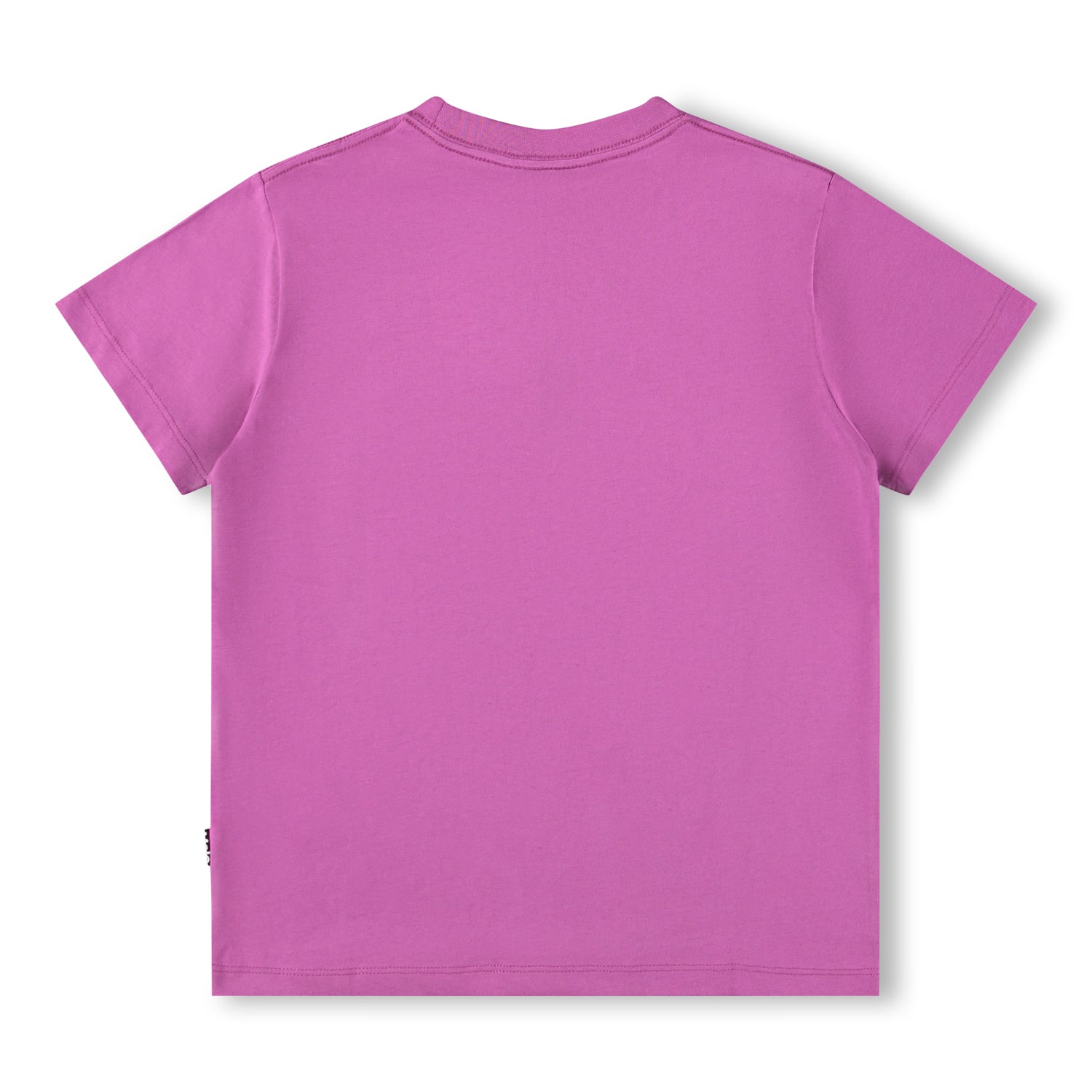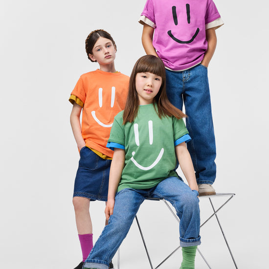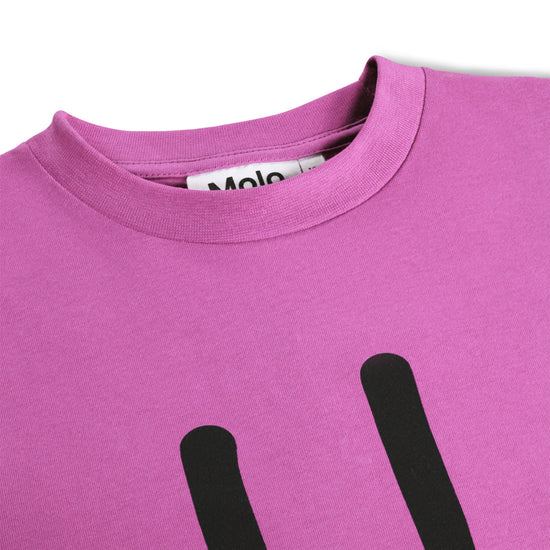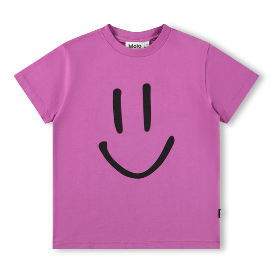 Purple t-shirt made of soft organic cotton with short sleeves and a ribbed neckline. The t-shirt has a loose fit with a black print of a smiling face on the front.