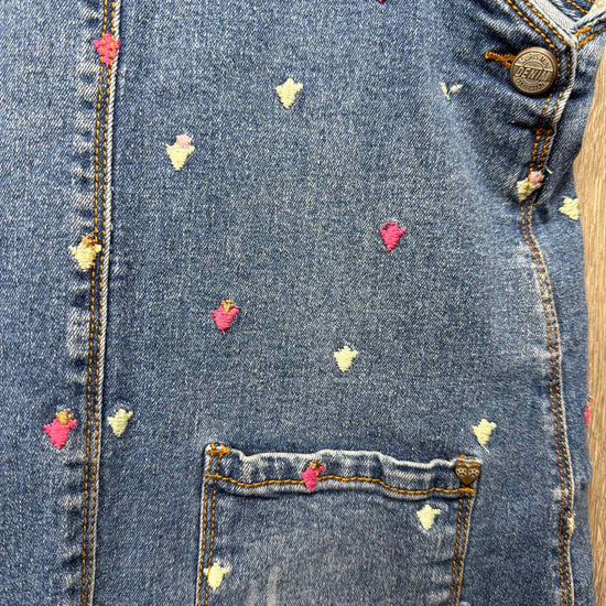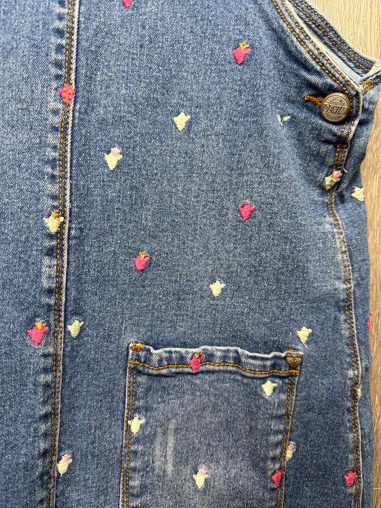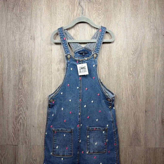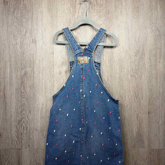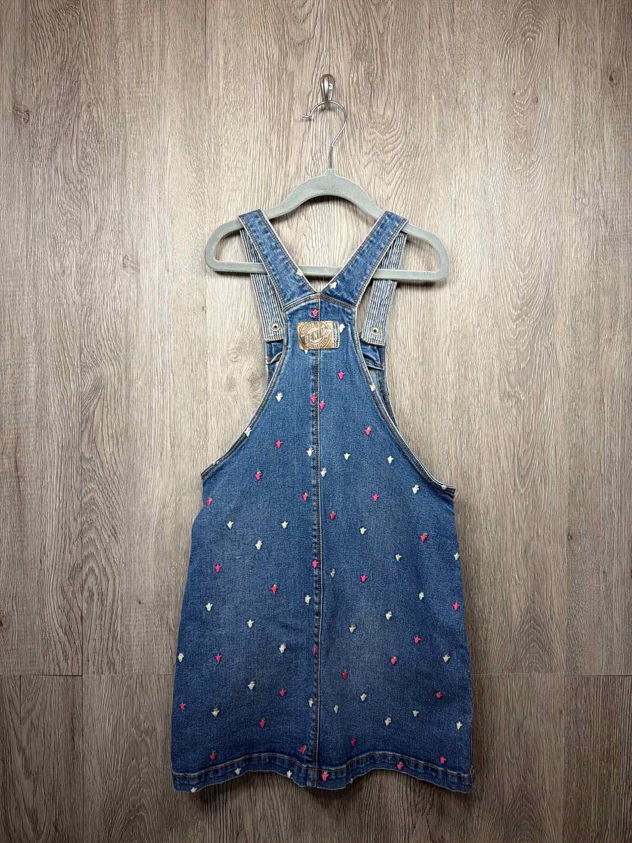 blue with multi color embroidered flower denim bib dress, two pockets on front, cotton/elastane blend #prelovedapril2026