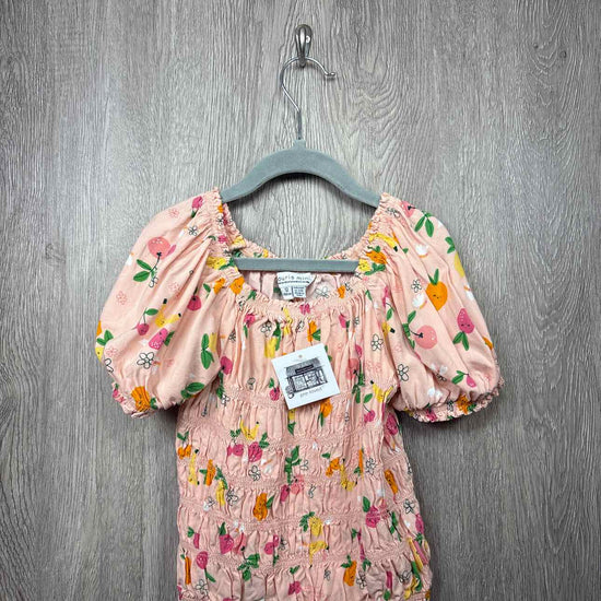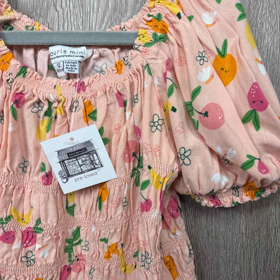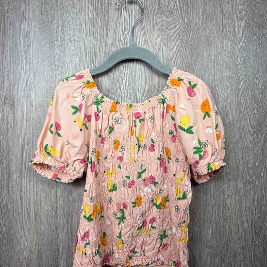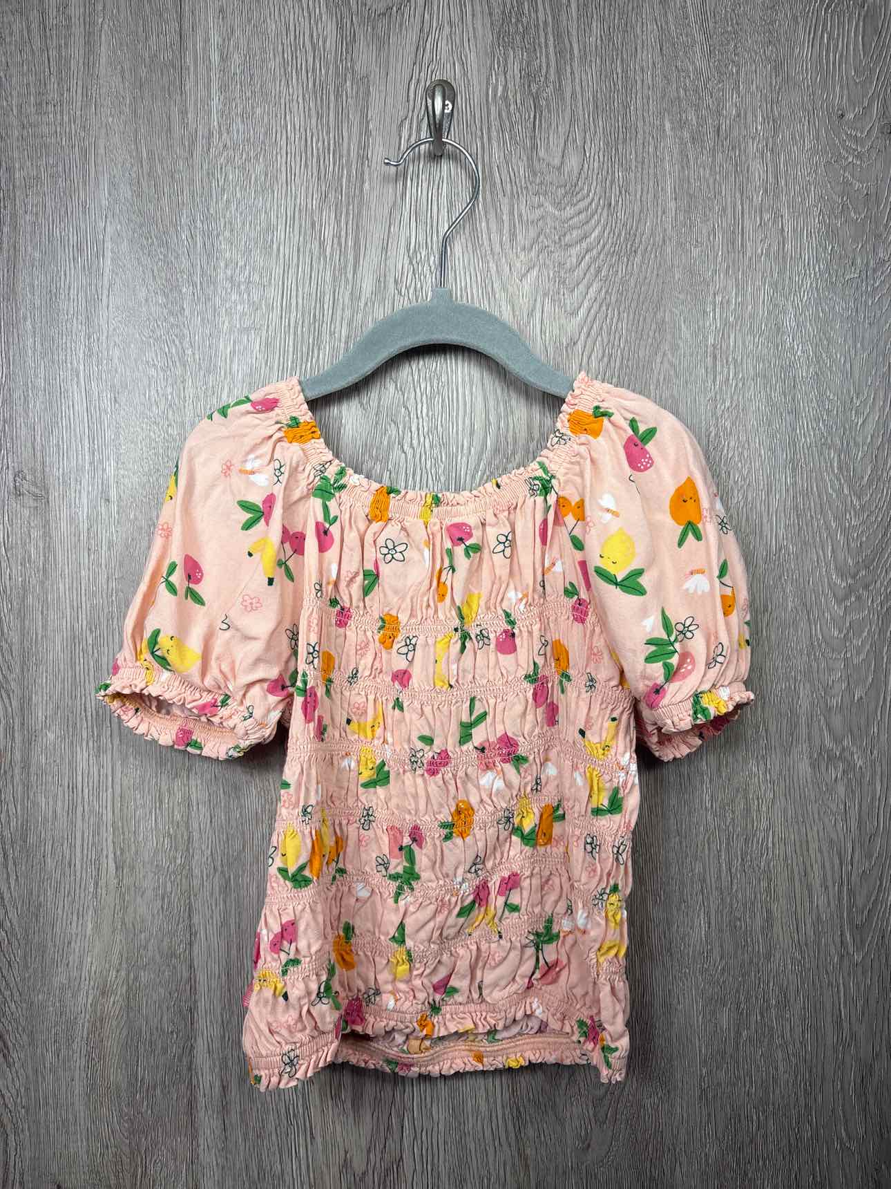 peach short sleeve elastic blouse with multi color fruit print, elastic neckline and cuffs, viscose #prelovedfebruary2026