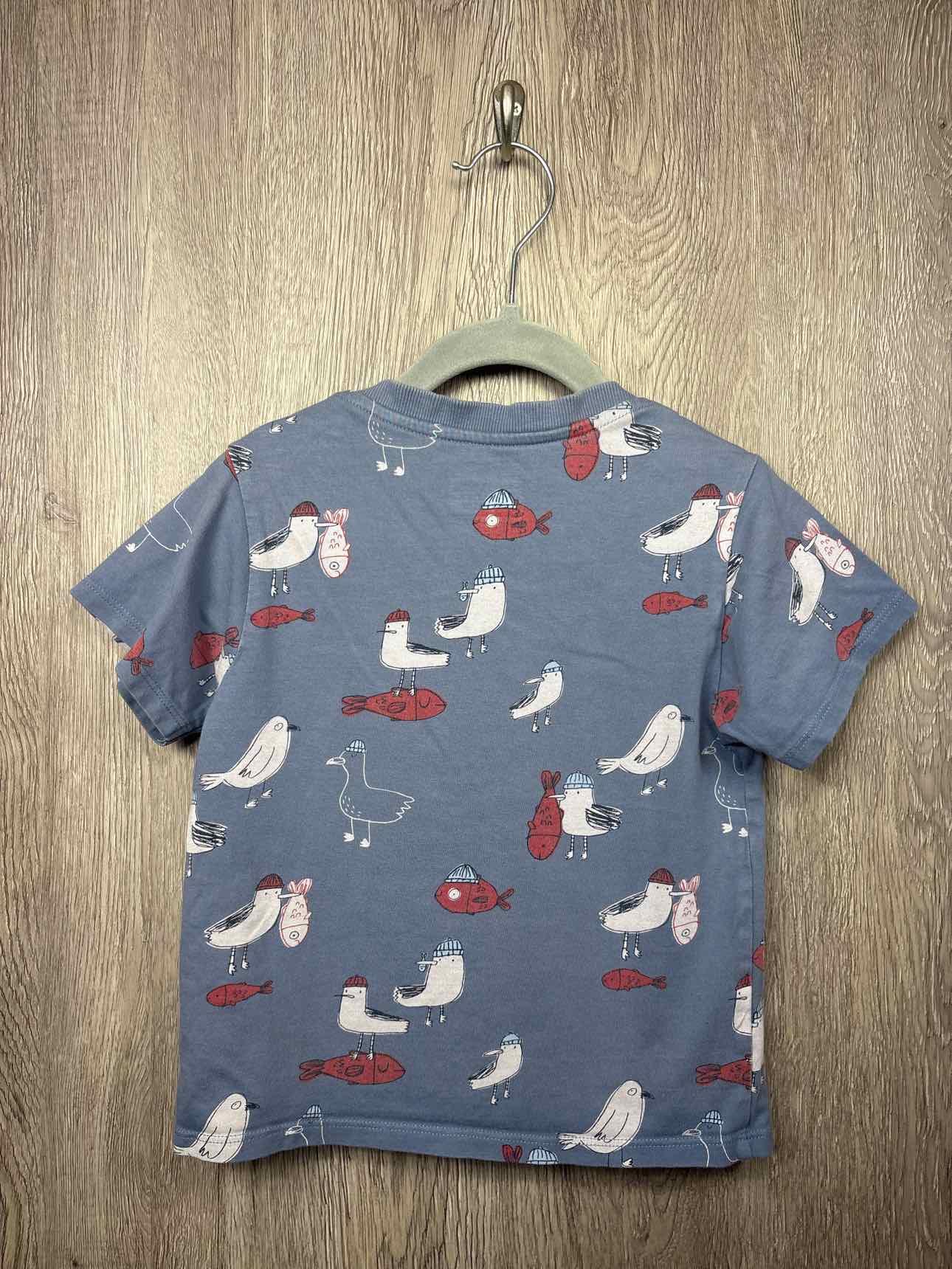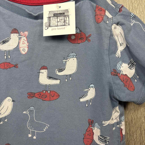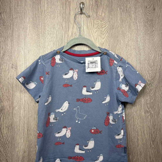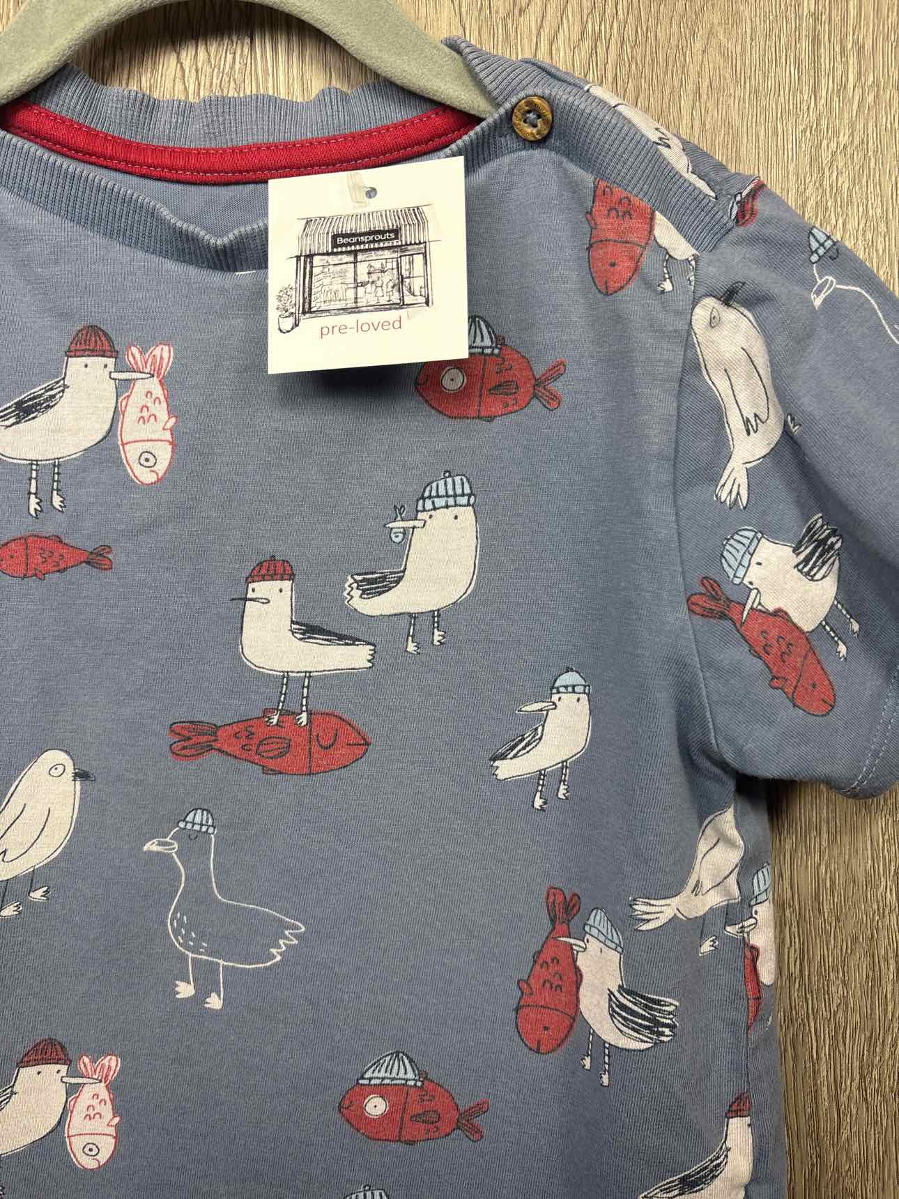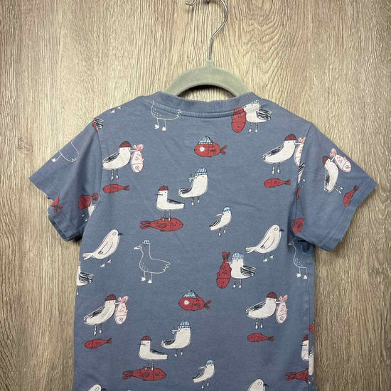 blue short sleeve shirt with bird/fish print, button on each shoulder, cotton #prelovedfebruary2026