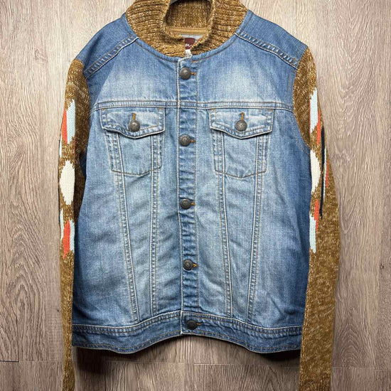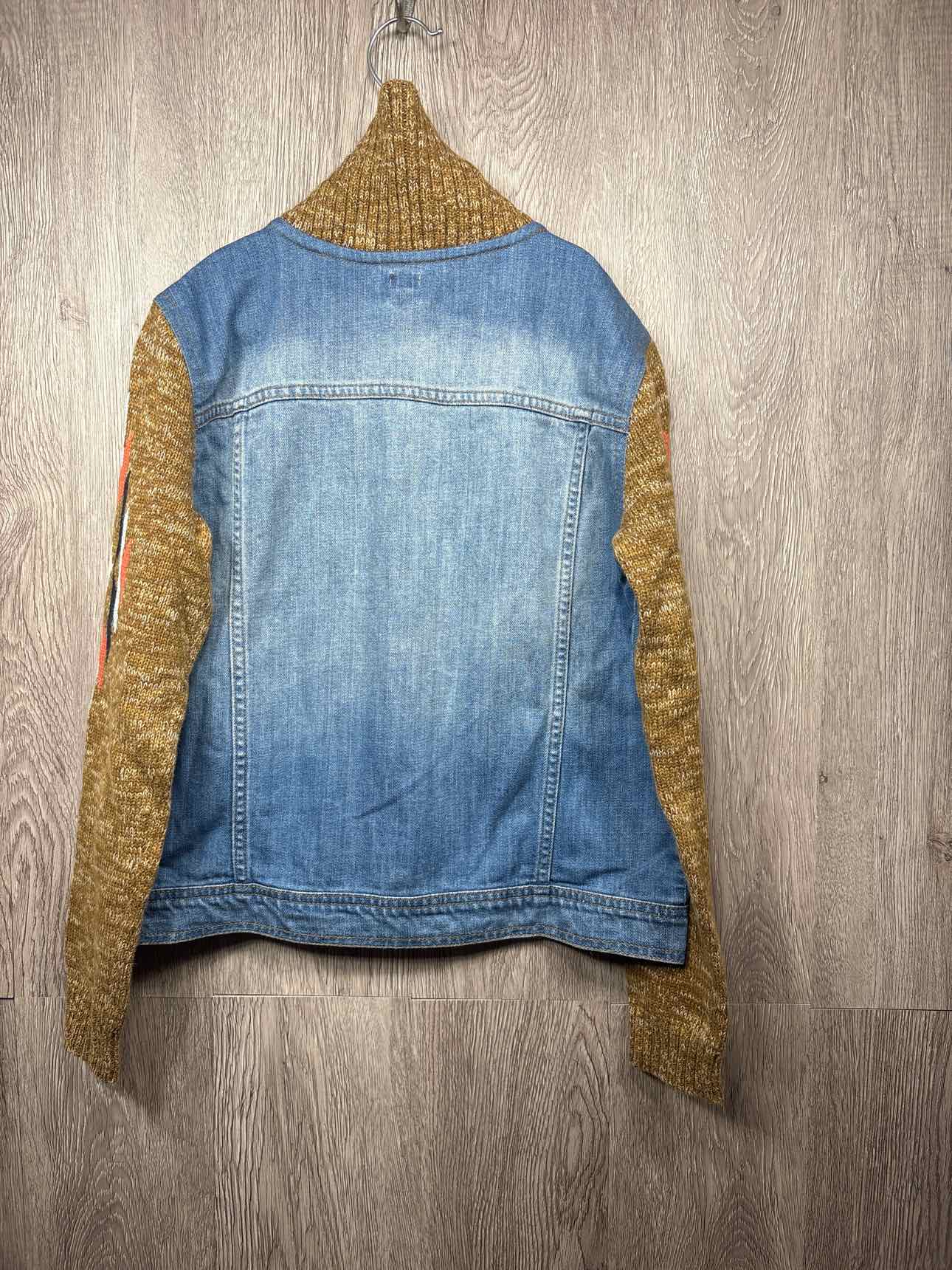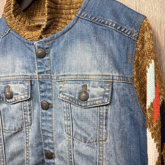 blue denim jacket with brown with pattern knitted sleeves and collar, buttons for closure, cotton #preloveddecember2025